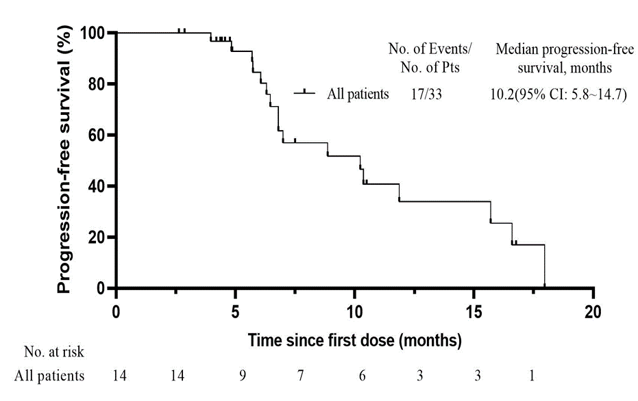中位随访时间13个月,研究结果显示,17例患者出现疾病进展,中位PFS达10.2个月(95% CI:5.8-14.7);高剂量TRT(>3Gy*10f或≥2Gy*25f)组中位PFS为7个月,低剂量TRT(≤3Gy*10f或<2Gy*25f)组中位PFS高达10.4个月,提示低剂量TRT联合免疫治疗可能为ES-SCLC患者带来进一步获益的趋势,但仍然需要大型Ⅲ期临床研究进一步验证。